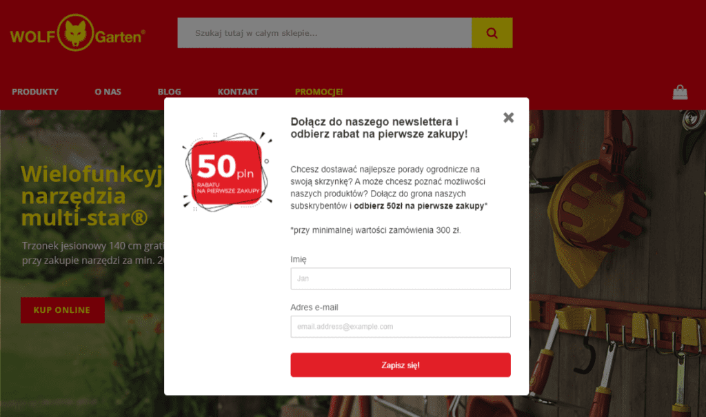 Najskuteczniejszymi sposobami na pozyskiwanie zapisu na newsletter są: pop-up (wyskakujące okienko z polem do wpisania email), belka u góry strony oraz widget z zapisem w stopce strony. Te 3 miejsca gwarantują nam, że odwiedzający w trakcie przeglądania witryny natknie się na tę informację przynajmniej raz i będzie mieć świadomość, że może łatwo zdobyć kod rabatowy na swoje zamówienie.