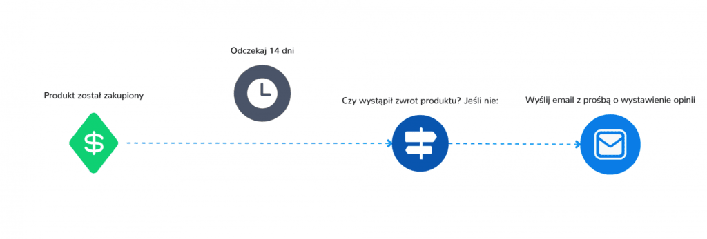 Ustawiony wcześniej scenariusz prowadzi do wysyłania klientom, którzy zakupili od nas produkt wiadomości z prośbą o pozostawienie opinii. Może przekierować go w dowolne miejsce i po kolei zapełnić opiniami klientów nasze profile w odpowiednich miejscach. Dodatkowo możemy też zabezpieczyć się przed nakłanianiem do złożenia opinii niezadowolonych klientów. Wcześniej utworzony segment klientów niezadowolonych posłuży nam za grupę, którą wykluczymy w tym scenariuszu, przez co prośba o opinię nie zostanie do nich przesłana.