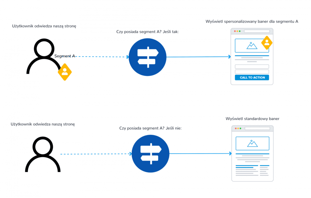 Dostosowanie treści do potrzeb lub zainteresowań odpowiedniego klienta to jeden z najskuteczniejszych zabiegów marketingowych. Marketing Automation daje nam świetne możliwości w zakresie personalizacji nie tylko treści wiadomości email, ale również konfiguracji elementów strony, tak aby wyświetlały odpowiednią zawartość w zależności od tego kto ją przegląda. Najprostszym przykładem takiej segmentacji jest pokazywanie baneru dedykowanego mężczyznom lub kobietom, w zależności od tego, jak Marketing Automation rozpozna płeć naszego użytkownika. Innym zastosowaniem tej funkcjonalności może być zaproponowanie nowego produktu w niższej cenie, w zależności od tego, czy dany użytkownik już wcześniej skorzystał z tej oferty.