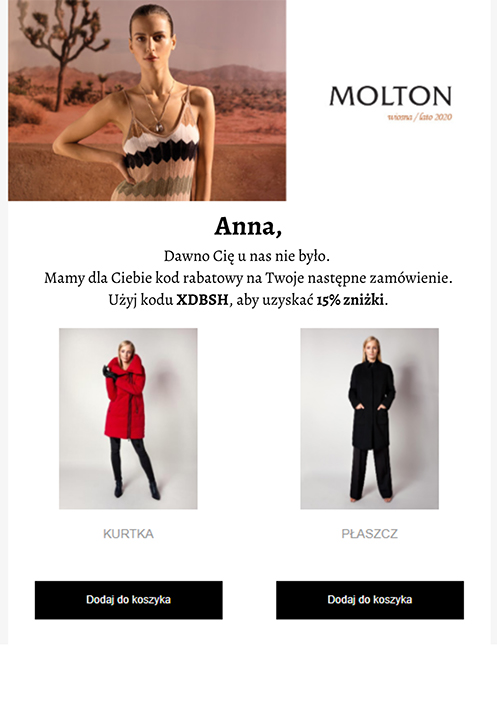 Segmentacja klientów ma jednak więcej zastosowań niż tylko cross-selling. Dzięki odpowiedniemu skonfigurowaniu reguł segmentacji w narzędziu MA możemy np. stworzyć segment klientów powracających, którzy np. dokonali więcej niż dwóch transakcji i wysyłać im spersonalizowaną wiadomość z podziękowaniem za lojalność, a także dorzucić dedykowany kod rabatowy. Klient na pewno doceni taką komunikację, co w szerszej perspektywie przełoży się na pozytywny stosunek wobec marki.