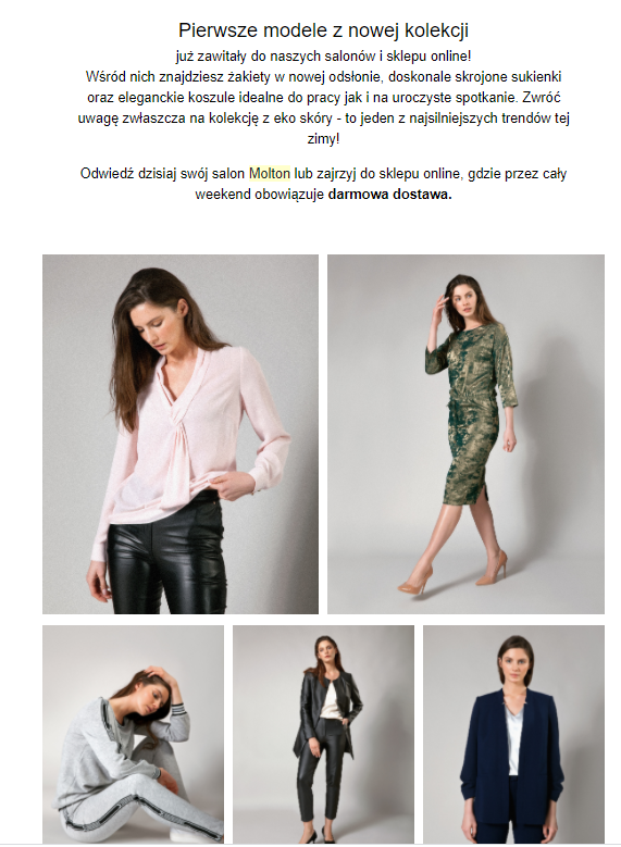 Sklepy odzieżowe mogą pochwalić się w newsletterze nową kolekcją lub przesłanymi przez klientów zdjęciami najciekawszych kreacji, powstałych z użyciem produktów marki. Newsletter może być też miejscem, w którym zapowiadamy nadchodzące promocje w sklepie lub poinformujemy o organizowanym konkursie, czy prowadzonych działaniach charytatywnych. Główną rolą newslettera powinno być utrzymywanie kontaktu z klientem, tak aby świadomość marki nigdy nie wygasła, a klient w momencie decyzji zakupowych pamiętał o naszym istnieniu.