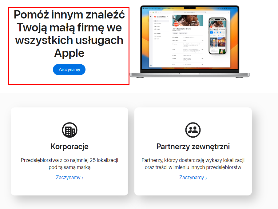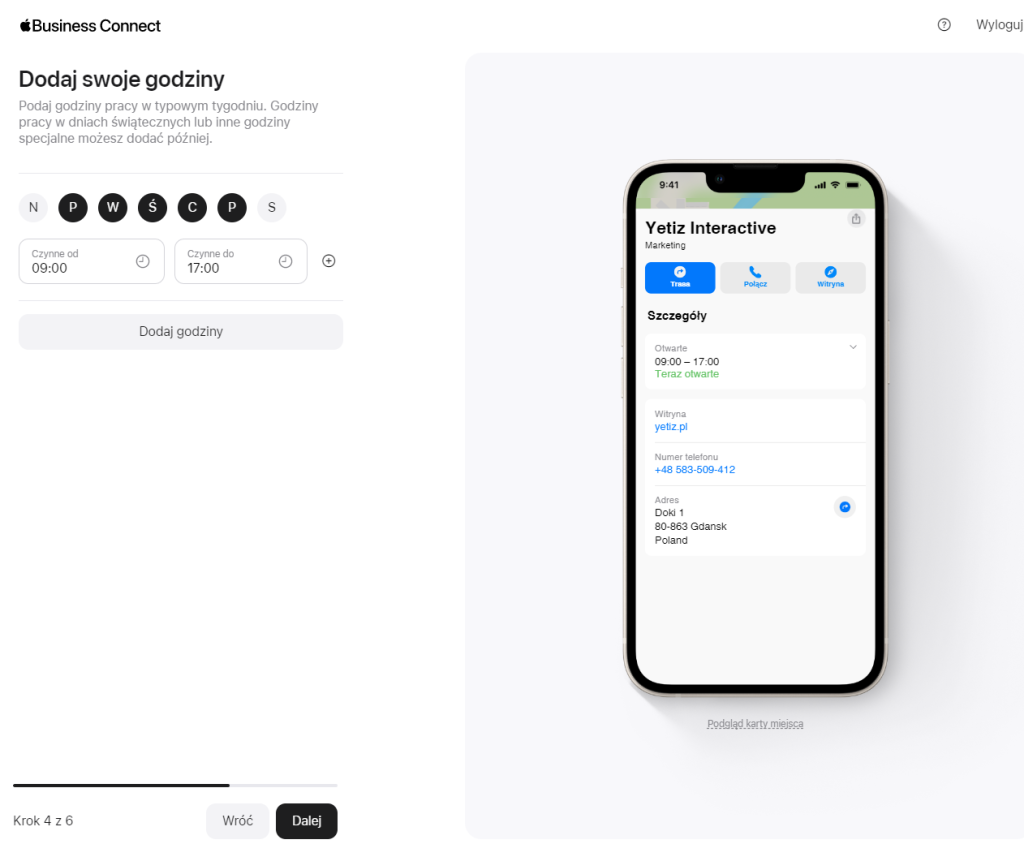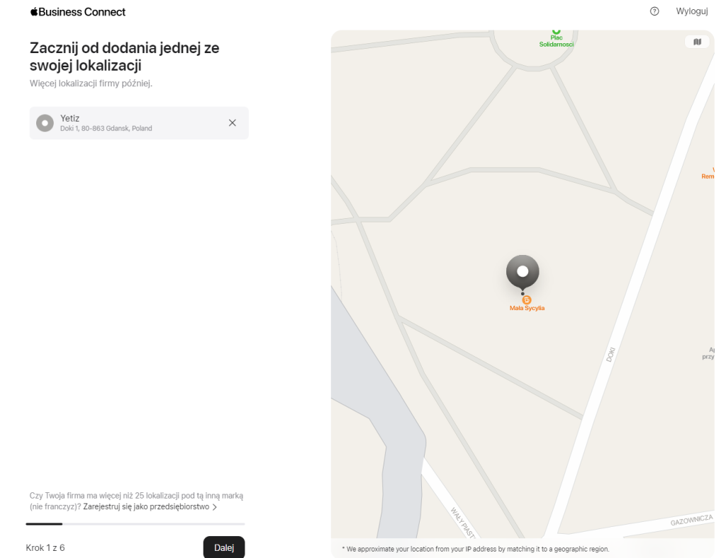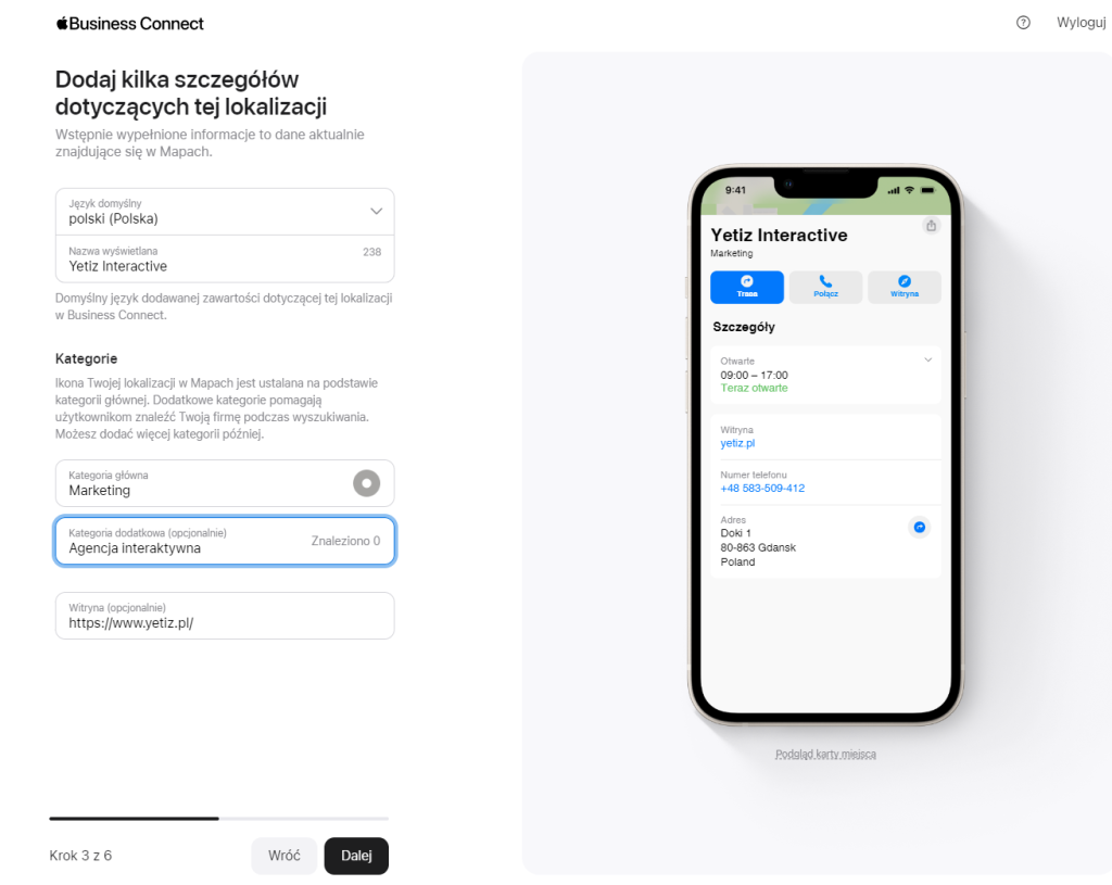 Poniżej, na przykładzie naszej Yetizowej wizytówki, przedstawiam proces zakładanie Profilu w Apple Business Connect. Jest prosty i podobny do tego, który znamy z Profilu Firmy Google.