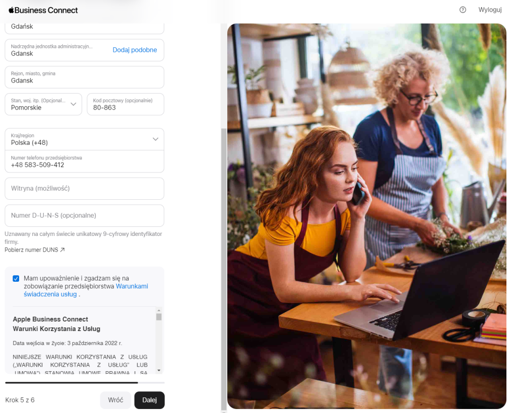 Po zalogowaniu się na konto Apple Business Connect zaznaczamy pierwszą zgodę na korzystanie z ABC oraz opcjonalnie drugą, jeżeli chcemy dostawać maile marketingowe od Apple.