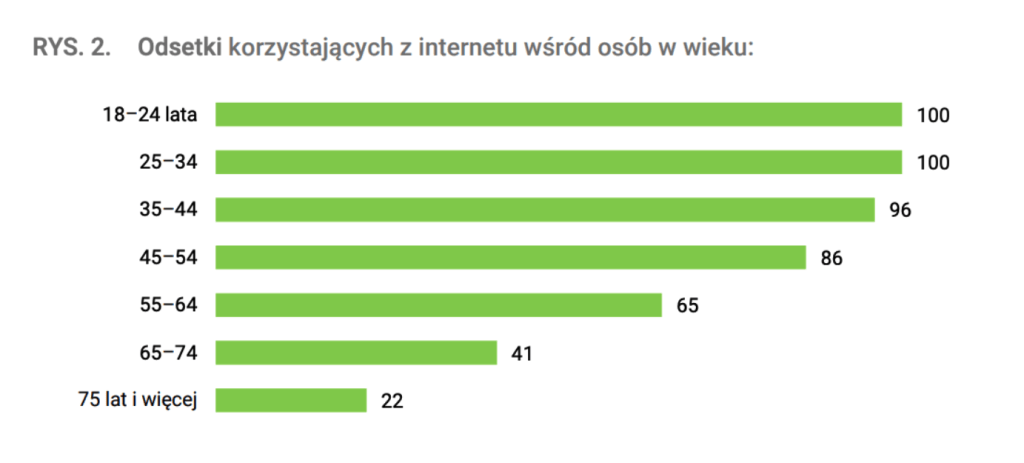 - W Polsce aż 65% osób w wieku 55-64 lat korzysta z internetu, natomiast w przedziale wiekowym 65-74 lat, jest to 41%.