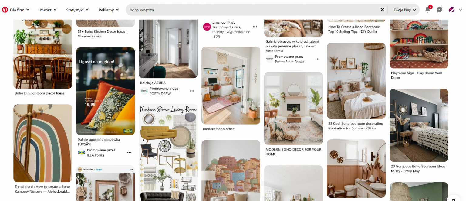Wszystko tutaj opiera się na wizualnym odbiorze, dlatego Pinterest świetnie sprawdzi się przy produktach, które można w ciekawy sposób pokazać. Tutaj pole do popisu mają branże dekoratorskie (wyposażenie wnętrz), odzieżowe i obuwnicze, kosmetyczne, motoryzacyjne, ogrodnicze, czy szeroko pojęta branża spożywcza.