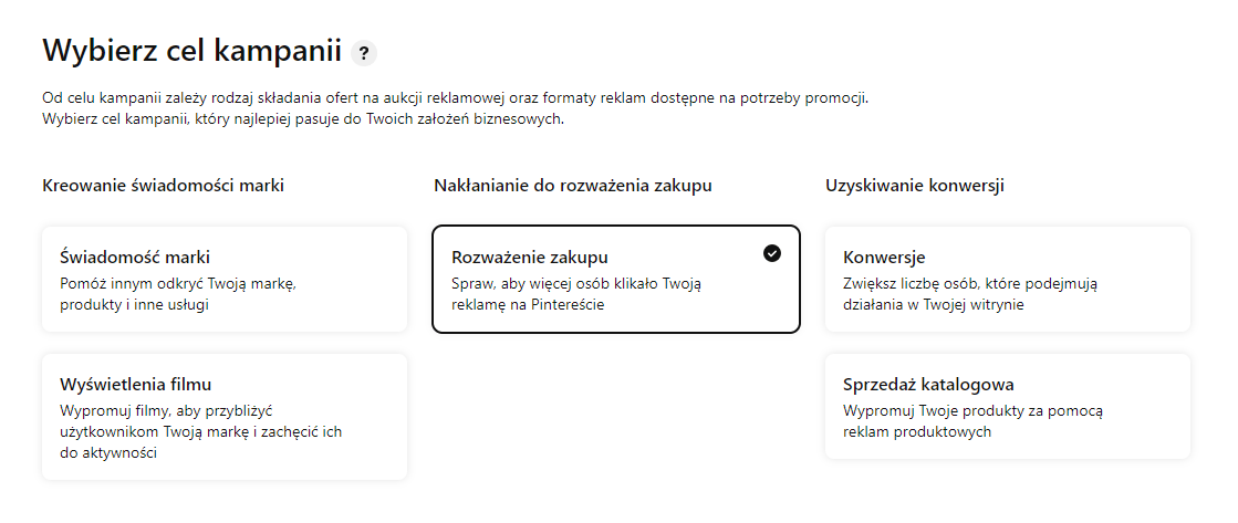 Po drugie reklama. Do wyboru jest kilka celów. Główne to świadomość, rozważenie zakupu (ruch) oraz konwersje (w tym sprzedaż z katalogu). Cały panel reklamowy jest bardzo zbliżony do panelu reklamowego Meta. Tu również można wybrać grupę docelową po zainteresowaniach lub używać niestandardowych grup odbiorców. Jednak to, co różni tę platformę od Facebooka i Instagrama to możliwość targetowania po słowach kluczowych.