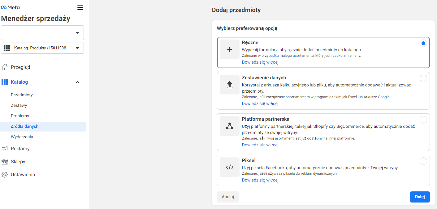 Istotą katalogów jest pokazanie asortymentu, którym dysponujemy. Katalog można utworzyć nawet wtedy, gdy nie mamy sklepu i wykorzystywać go do promocji, używając kolekcji lub karuzel, chociażby przy remarketingu dynamicznym i reklamach. Katalog przyda nam się także przy tworzeniu sklepu. Produkty do katalogu można dodawać ręcznie lub przez automatyczną synchronizację z platformą sprzedażową.