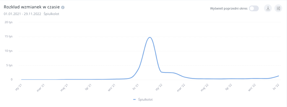 Poniżej znajduje się screenshot z panelu SentiOne, który przedstawia rozkład wzmianek w czasie. Publikacje w swojej treści lub/i kontekście zawierały słowo “śpiulkolot”.