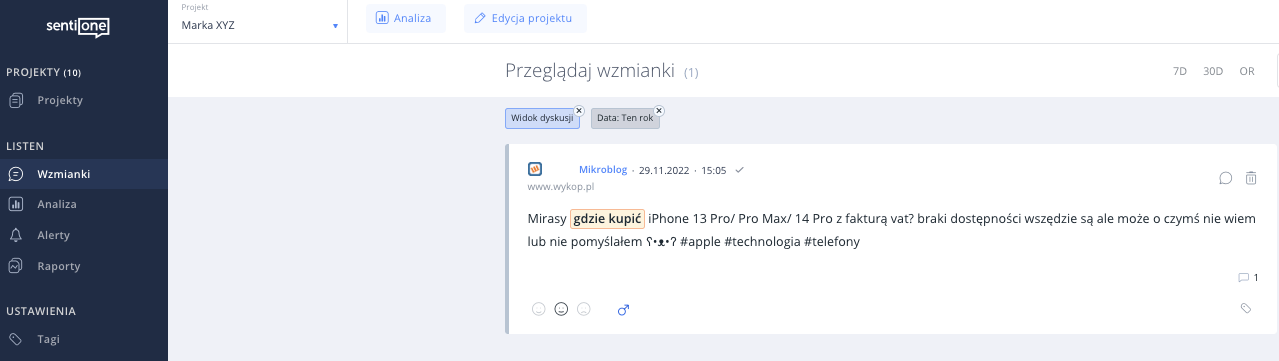 Widżety dostępne w widoku Analizy (jest ich znacznie więcej niż na powyższym screenshocie) pokażą nam podstawowe dane, np. liczbę i zasięg wzmianek w czasie, ich wydźwięk czy najpopularniejsze źródła. Zadaniem analityka będzie zagłębienie się w liczbowe zestawienia i wyłuskanie z nich kluczowych oraz wartościowych wniosków. Aby badanie było jeszcze bardziej szczegółowe, do dyspozycji mamy zakładkę Wzmianki, w której możemy czytać i tagować wszystkie zebrane przez system publikacje. Pozwoli to przypisać dane do konkretnych kategorii i przedstawić szczegółowy zakres tematyki poruszanej w kontekście Marki XYZ.