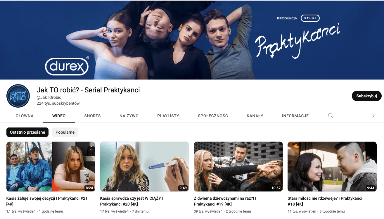 Zespół SentiOne na zlecenie marki przeanalizował tematykę związaną z seksem, która pojawiała się na najpopularniejszych forach młodzieżowych. Poruszane zagadnienia zostały przypisane do konkretnych kategorii: anatomia, antykoncepcja, masturbacja, mity, seks i inne. Następnie każda z nich została dogłębnie przeanalizowana. Durex we współpracy z Grupą Abstra (obecnie Studi), między innymi na podstawie danych i wniosków zawartych w raporcie, utworzył kanał poświęcony edukacji seksualnej “Jak TO Robić”. Kanał obecnie posiada 224 tys. subskrybentów i ponad 45 mln wyświetleń. Więcej szczegółów znajdziesz tutaj.