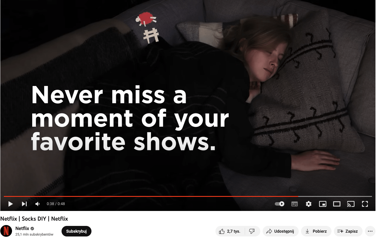 Netflix niejednokrotnie wykazał się swoim zaangażowaniem w budowanie bliskich relacji ze swoimi odbiorcami. Komunikacja marki na każdym kroku pokazuje, że Netflix dobrze zna swoich odbiorców i trendy, którym się poddają. W odpowiedzi na zjawisko binge-watching (kompulsywne oglądanie seriali) i problemów jemu towarzyszących, opisywanych przez internautów w sieci, Netflix wyprodukował inteligentne skarpety. Skarpety zatrzymują serial, kiedy ich użytkownik niespodziewanie zaśnie. Dodatkowo marka podzieliła się instrukcją, jak zrobić takie skarpetki samodzielnie.