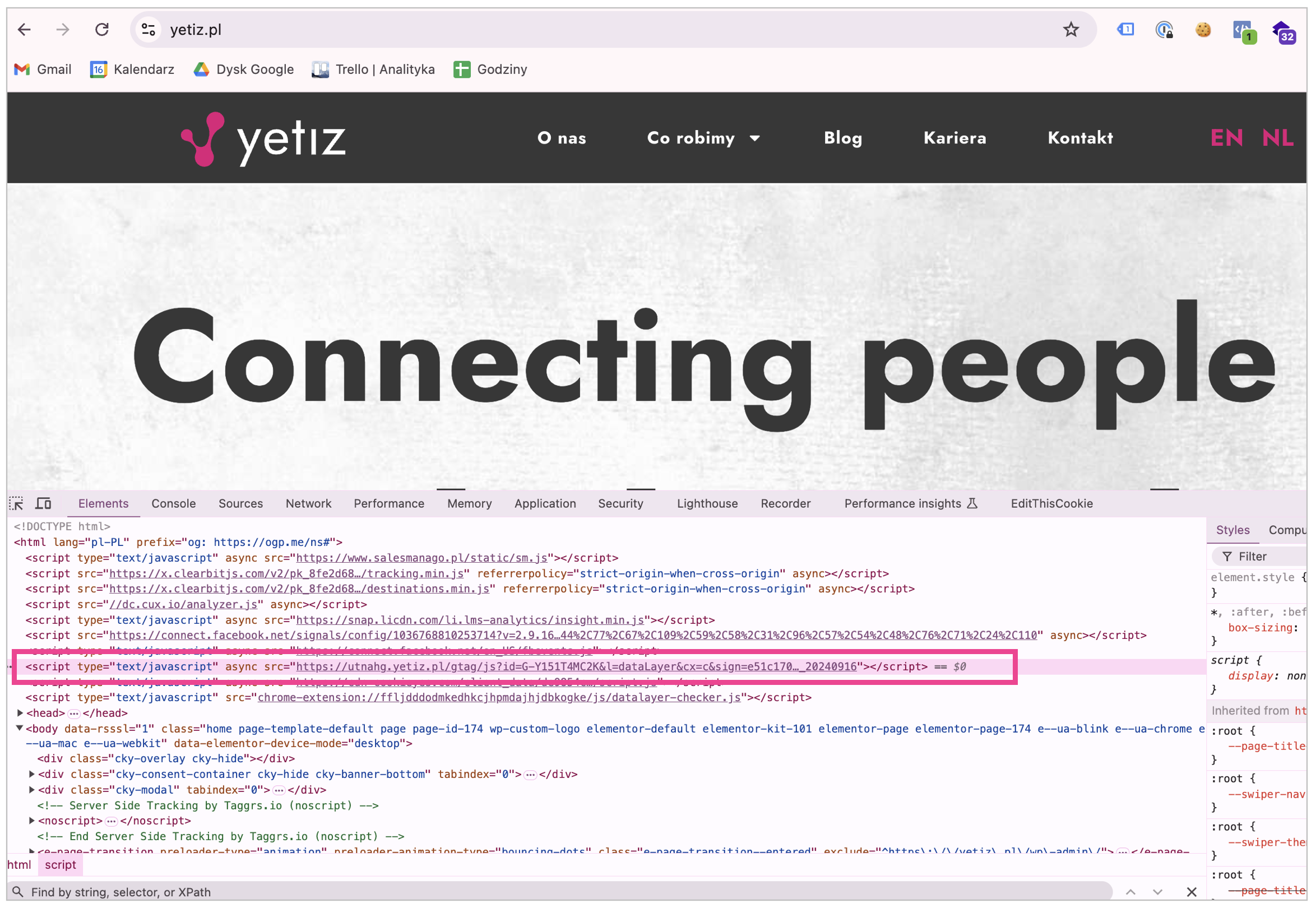 W sytuacji, gdy użytkownik zgadza się na śledzenie przy pomocy banera na stronie www, ale jednocześnie używa adblocka, ciasteczka 3rd party i skrypty usług reklamowych oraz analitycznych są blokowane. Dlatego też sam GTM client-side nie byłby w stanie wysłać szczegółowych danych do innych narzędzi. Jednak w momencie, kiedy na stronie dodatkowo wdrożony jest server-side GTM, skrypt GA4 uruchamiany jest w kontekście 1st party data (screenshot poniżej), ponieważ kontener GTM osadzony jest w subdomenie witryny, czyli w chmurze. Następnie dane z ciasteczek 1st party wysyłane są do serwera, czyli server-side GTM i potem, zgodnie z określoną konfiguracją, dalej do narzędzi, których używasz do prowadzenia reklam i analityki.